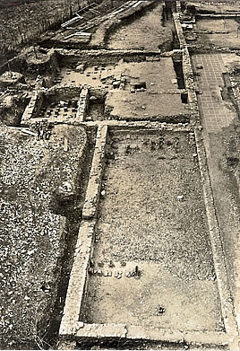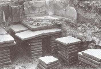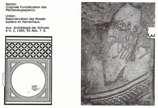 | Oben: Detail des grossen Wohnraumes mit Mosaik und Bodenheizung sowie Platten der Sockelverkleidung. Aus: W. Drack / R. Fellmann, Die Römer in der Schweiz (1988) 433 Abb. 399 Links: Die Wohnräume des Südflügels mit dem beheizten Bad. Foto Th. Strübin |